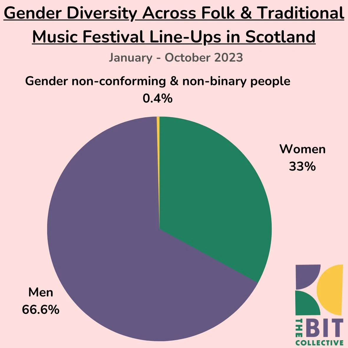 Fair Plé’s ‘Festival Line-Up Challenge’, which explored the (lack of) gender diversity among performers at folk and traditional music festivals in Ireland, found that across 40 festivals analysed, women made up only 36.2% of performers. We thought it would be useful to do some digging into the situation in Scotland.